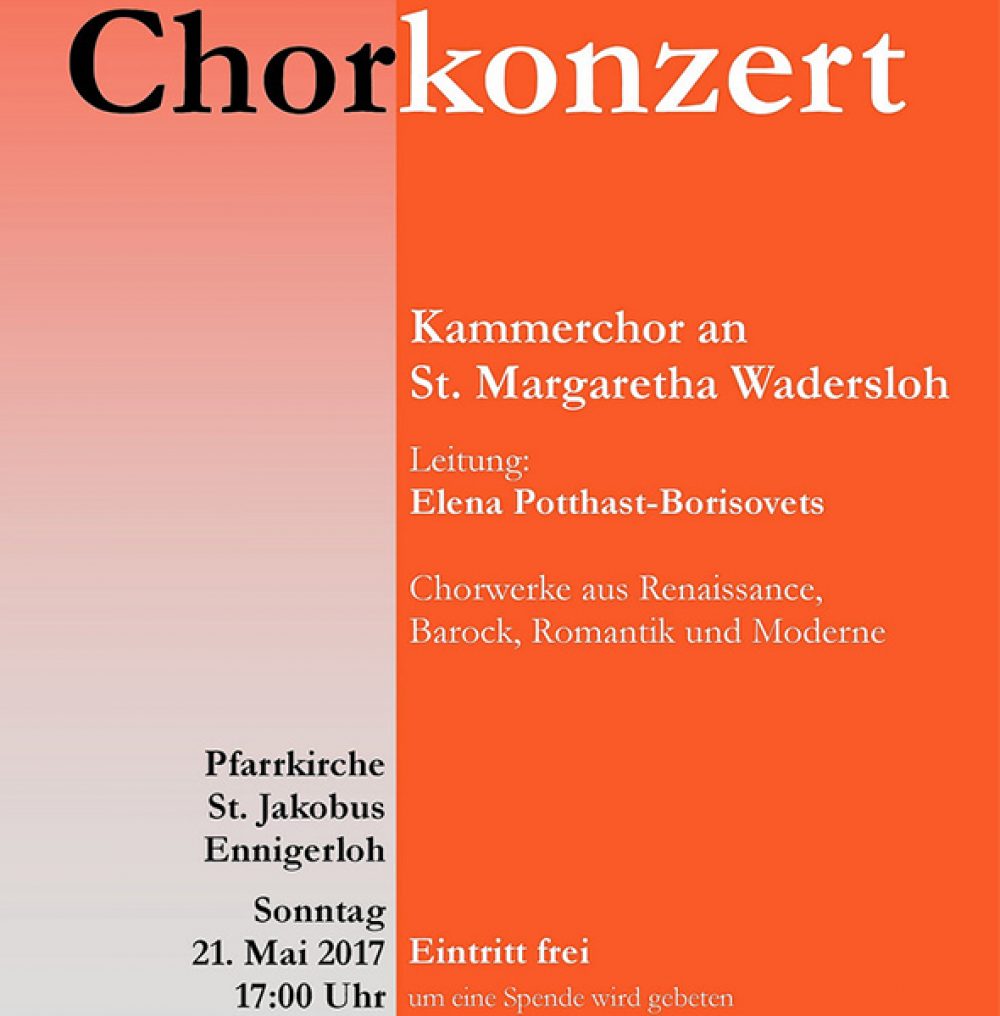 Der Verein zur Förderung der Kirchenmusik in Ennigerloh e.V. lädt herzlich zu einem Chorkonzert mit dem Kammerchor an St. Margaretha Wadersloh in die Pfarrkirche St. Jakobus ein. Am Sonntag, den 21. Mai, werden um 17:00 Uhr die Sänger und Sängerinnen unter der Leitung von Elena Potthast-Borisovets Chorwerke der Renaissance, des Barocks, der Romantik und der Moderne zu Gehör bringen. Unter dem Titel „Christe, du Lamm Gottes“ werden anspruchsvolle Chorwerke sowohl a cappella als auch mit Orgel- und Klavierbegleitung aufgeführt.