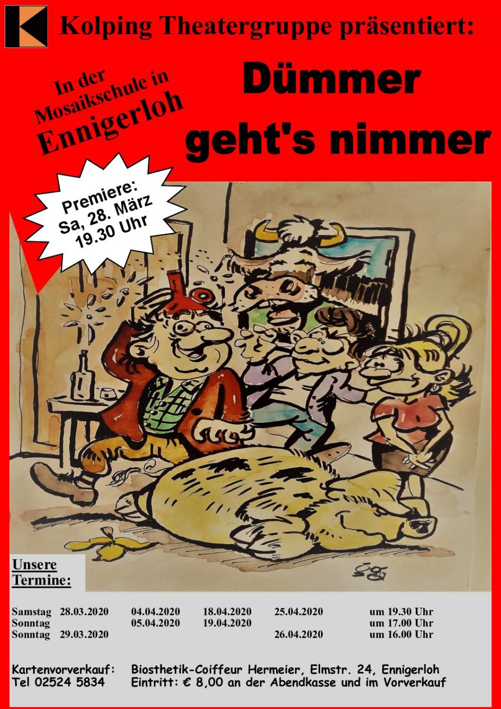 Ennigerloh. Die Kolping Theater Gruppe Ennigerloh hat mit den Proben für das neue Stück „Dümmer geht’s nimmer“ begonnen. Das Lustspiel in drei Akten stammt aus der Feder von Wilfried Reinehr und hat ihre Premiere am 28.03.2020 um 19.30 Uhr. Wie gewohnt wird das Stück in der Aula der Mosaikschule in Ennigerloh aufgeführt. Lassen sie Ihrer Freude freien Lauf wenn der Viehhändler Wurmlinger wegen einer Dummheit seines Gehilfen ins Gefängnis soll und seine Freunde ihm helfen wollen dieses zu umgehen, wobei sie natürlich mit einigen Hindernissen zu kämpfen haben. Geisteskrankheit, Irrenhaus und Spuk führen zu allerlei komplizierten Situationen. Haben wir Ihr Interesse geweckt ! Weitere Info auch unter : www.kolping-theater-ennigerloh.de