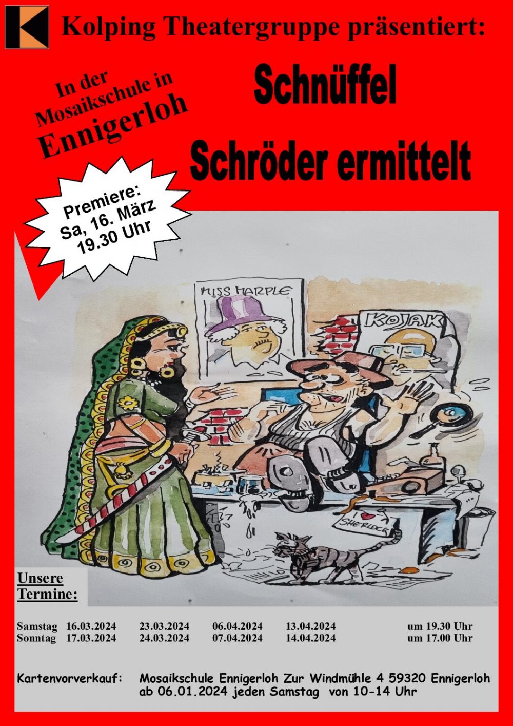Die Premiere für die Kriminalkömödie „Schnüffel Schröder ermittelt“ aus der Feder von Maria Böttcher findet am 16.03.2024 um 19.30 Uhr in der Mosaikschule Ennigerloh statt.