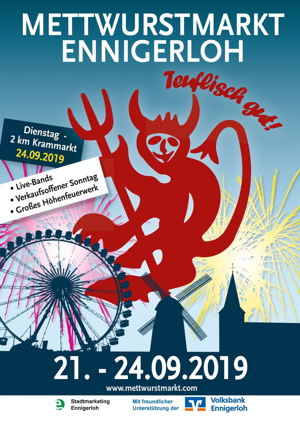 Der Mettwurstmarkt in Ennigerloh ist eines der Hightlights der Drubbelstadt, erstreckt sich über die gesamte Innenstadt und läuft über mehrere Tage. Parallel dazu hat bereits die mehrtätige Kirmes mit ihren modernen Fahrgeschäften für Jung und Alt sowie einer Vielfalt von Imbiss- und Süßwarenständen für jeden Geschmack gestartet. Während der vier Tage bis zum Dienstagabend erlebt der Besucher ein buntes Treiben in der Innenstadt, bestehend aus Bühnenprogramm, Livemusik, “Bullenschätzen”, Kram- und Trödelmarkt sowie einer Gewerbemeile. Als besonderes Ereignis des Mettwurstmarktes gilt das Feuerwerk am Samstagabend.