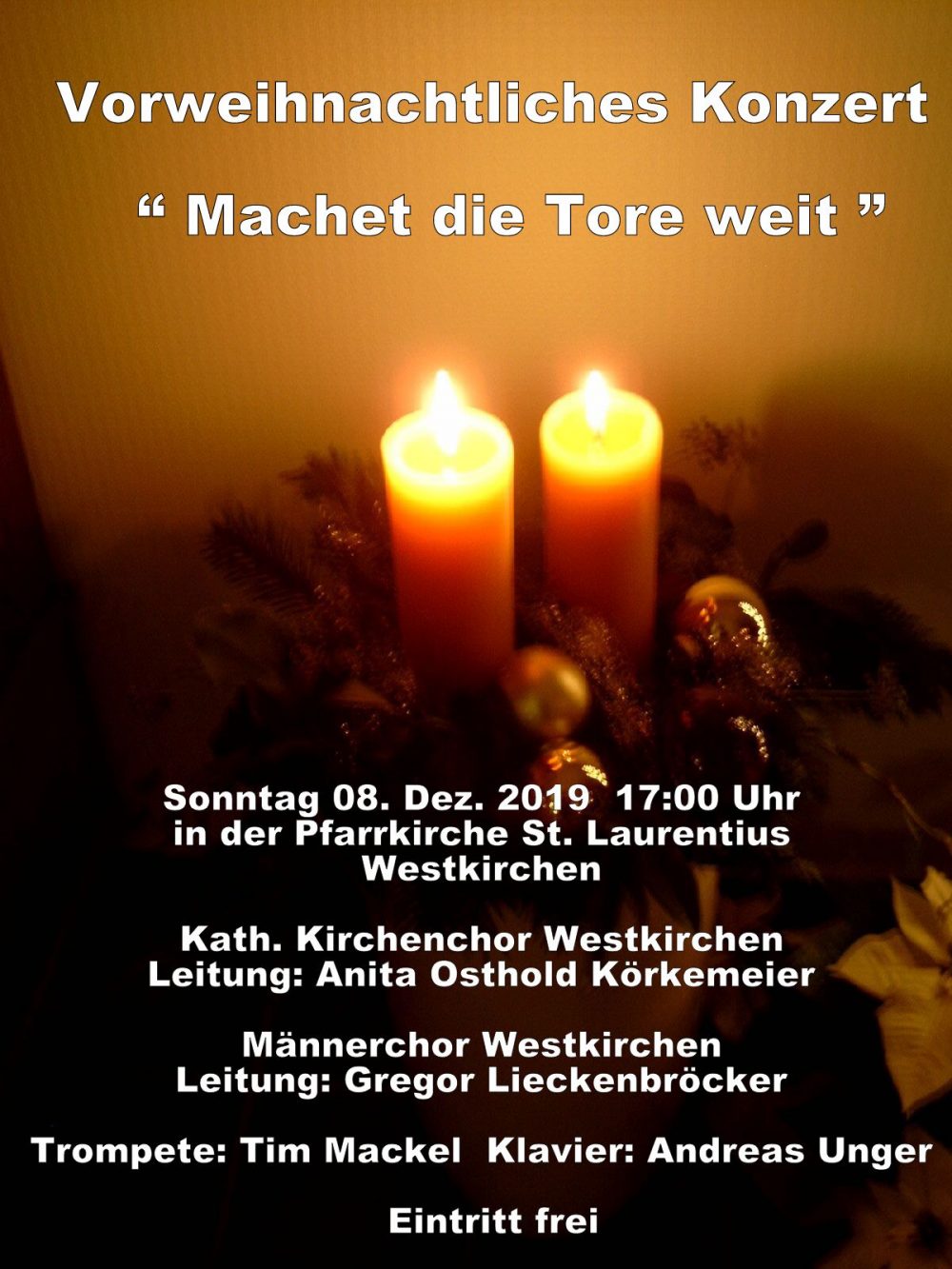 „Machet die Tore weit“ – unter diesem Motto lädt der Männerchor Westkirchen und der katholische Chor Westkirchen herzlich zum Weihnachtskonzert am 08.12.2019 um 17 Uhr in die St. Laurentius Kirche in Westkirchen ein.