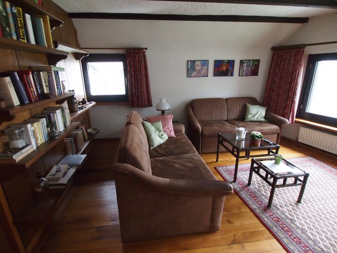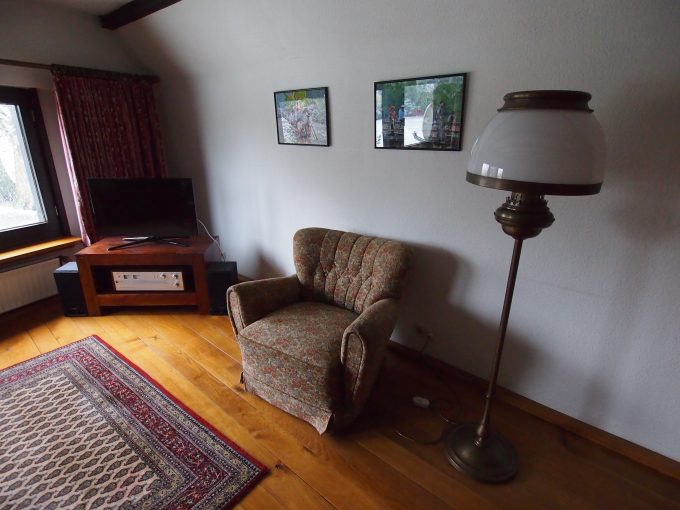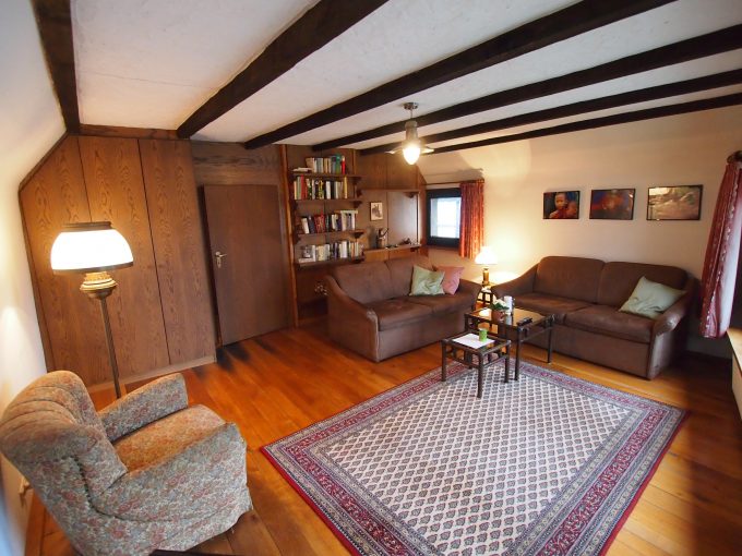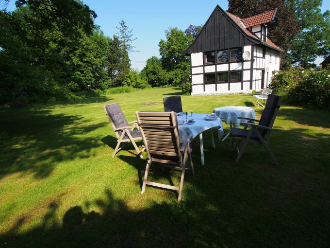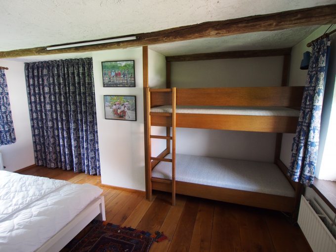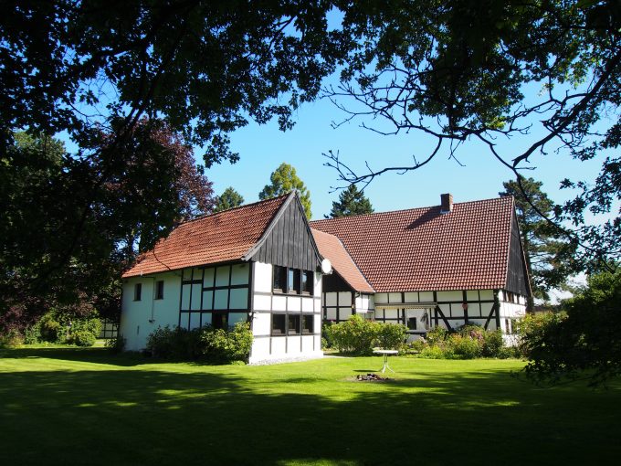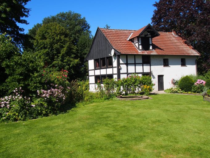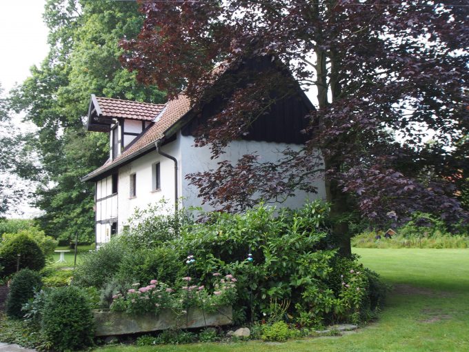 Das Ferienhaus ist ein Nebengebäude eines historischen, aus dem Jahre 1730 stammenden Bauernhofs und bietet auf 80 m² Wohnfläche Platz für vier Personen. Die Zimmer verteilen sich auf zwei Etagen: Im Erdgeschoss befindet sich die Küche mit einer gemütlichen Sitzecke. In der ersten Etage befindet sich das Wohnzimmer mit herrlichem Blick auf den parkähnlichen Garten, ein Duschbad mit Toilette, ein Schlafzimmer mit Doppeltbett, Etagenbett und einem kleinen Sekretär.
